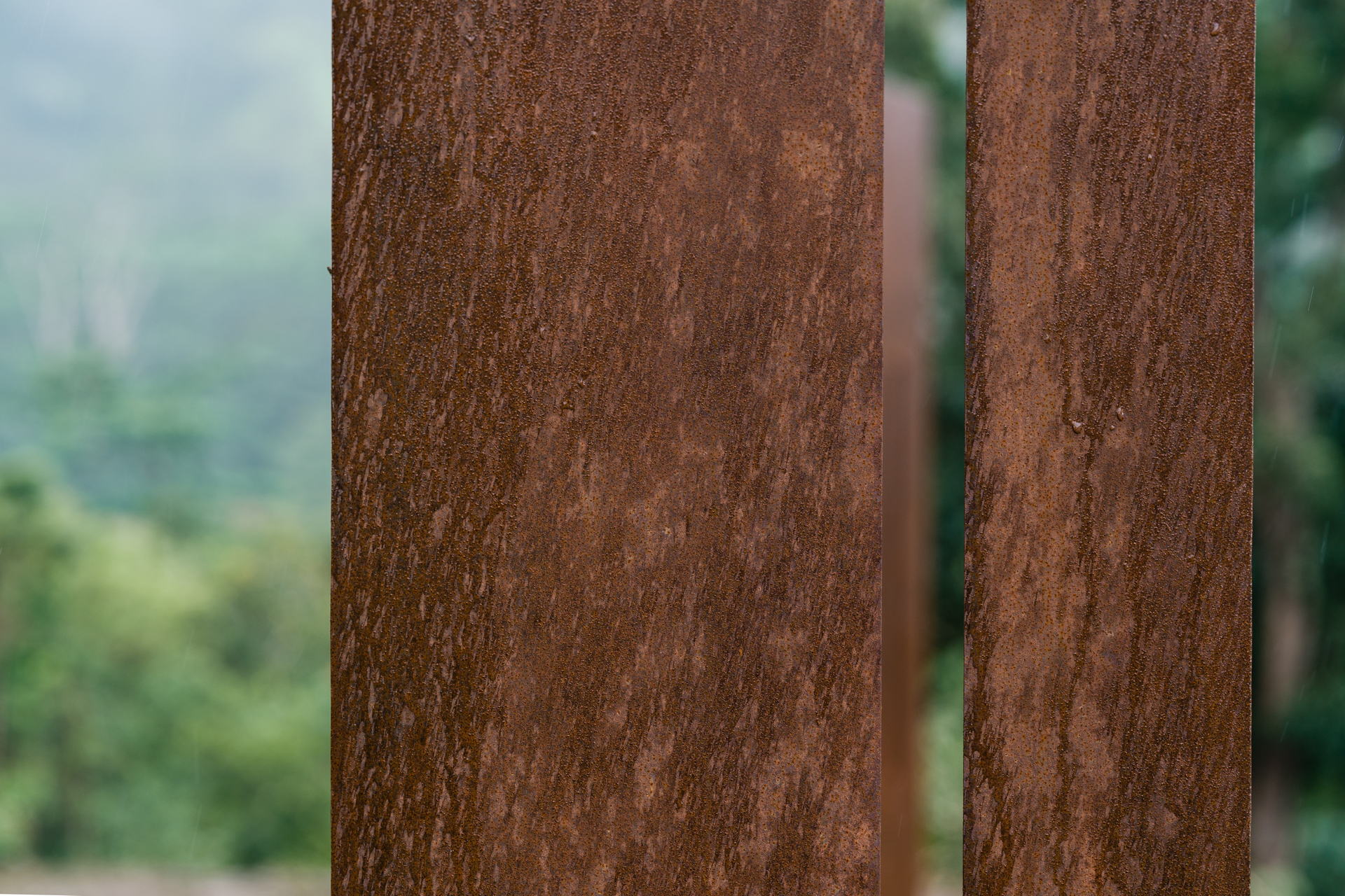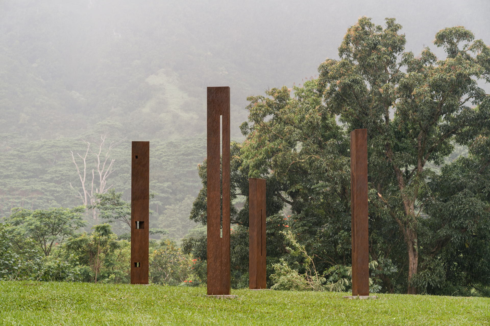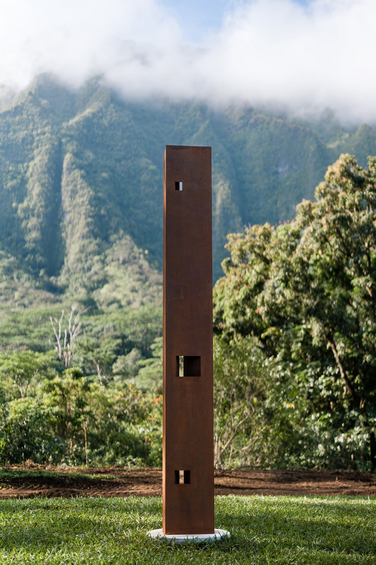 The steel forms, which were shaped, cut, and installed by human hands, stand firmly within the realm of kānaka. Beyond them rises the lush, cloud-laden, and enduring Koʻolau Mountain range, embodying the realm of the akua, formed through deep time by wind, rain, water, and genealogy.