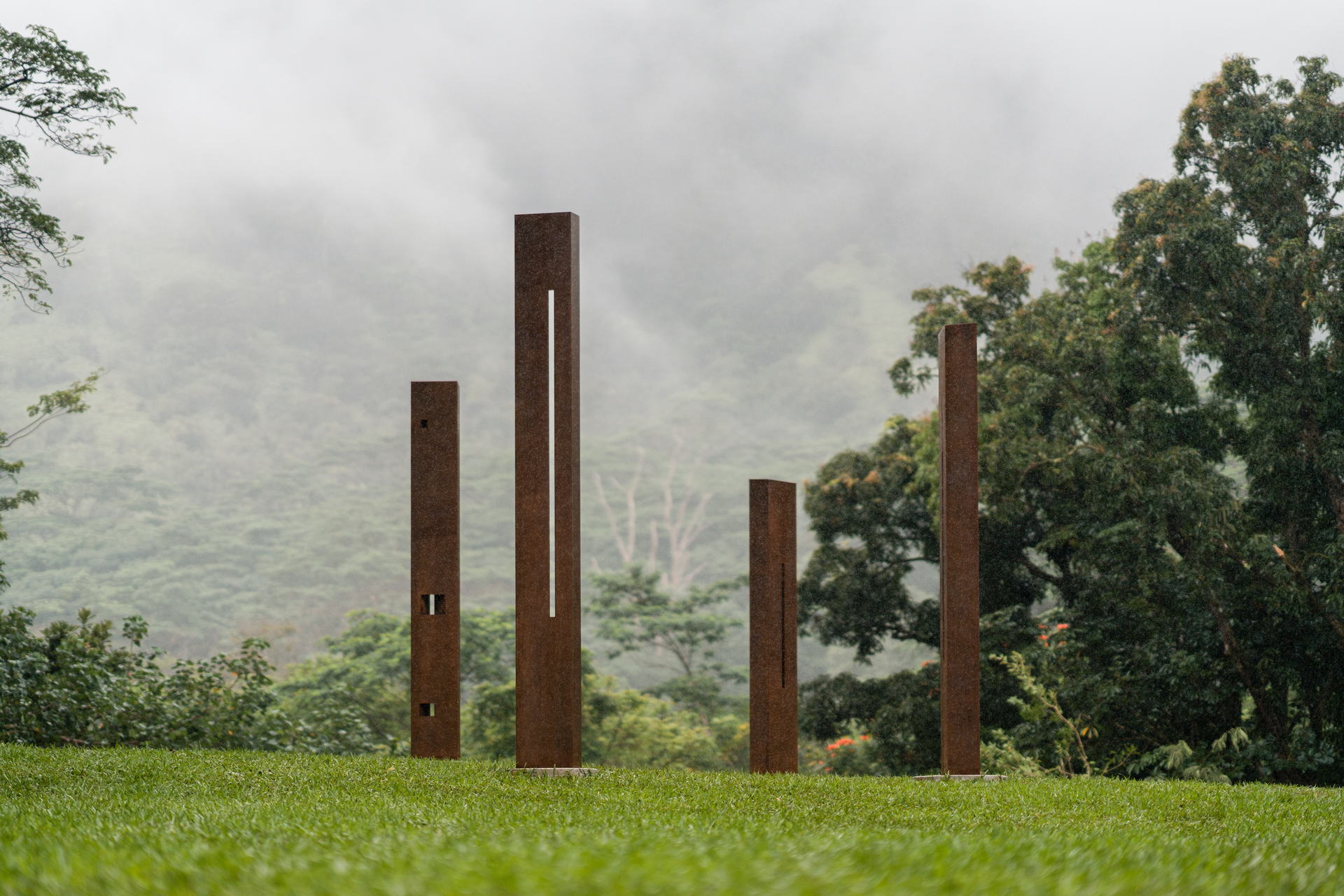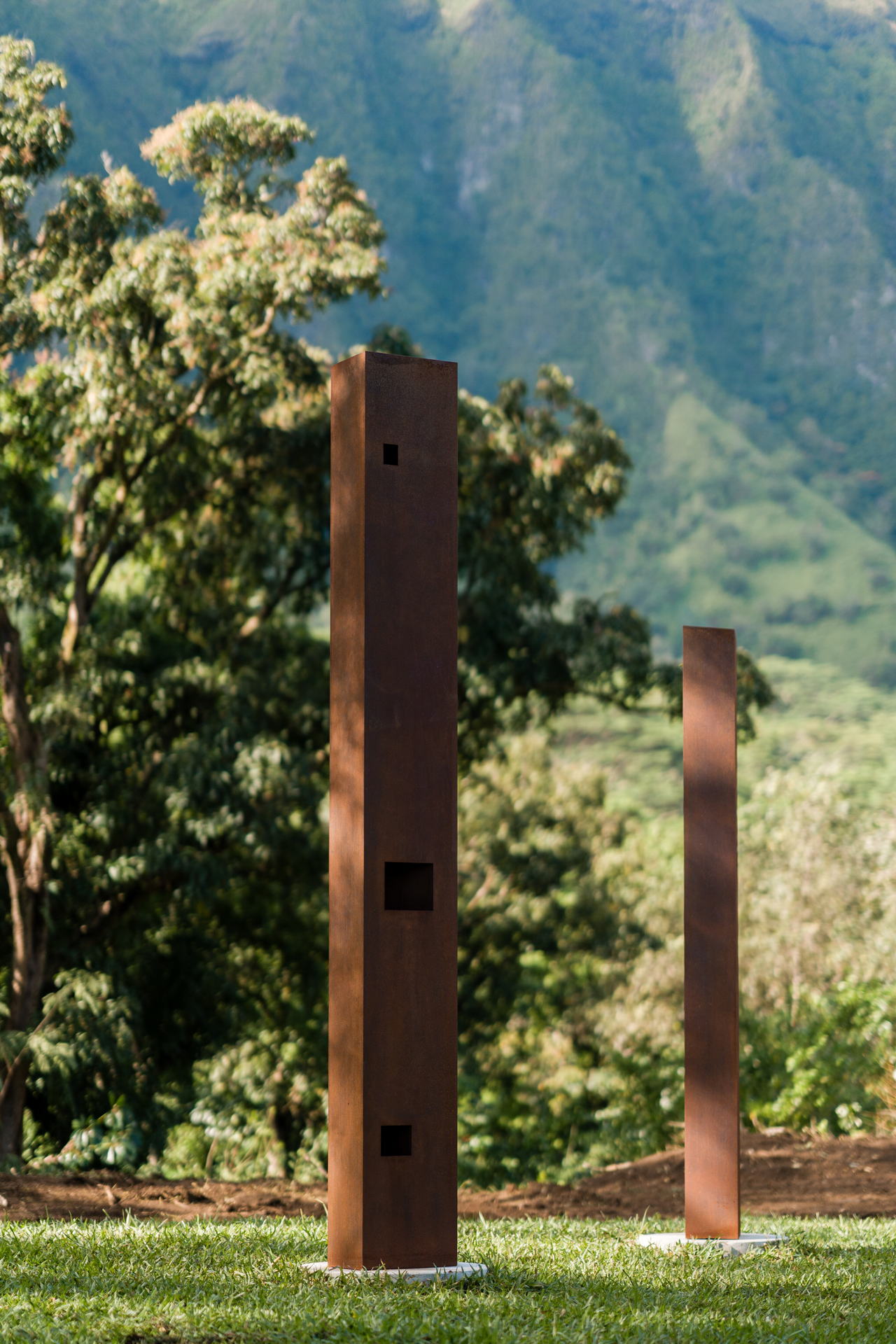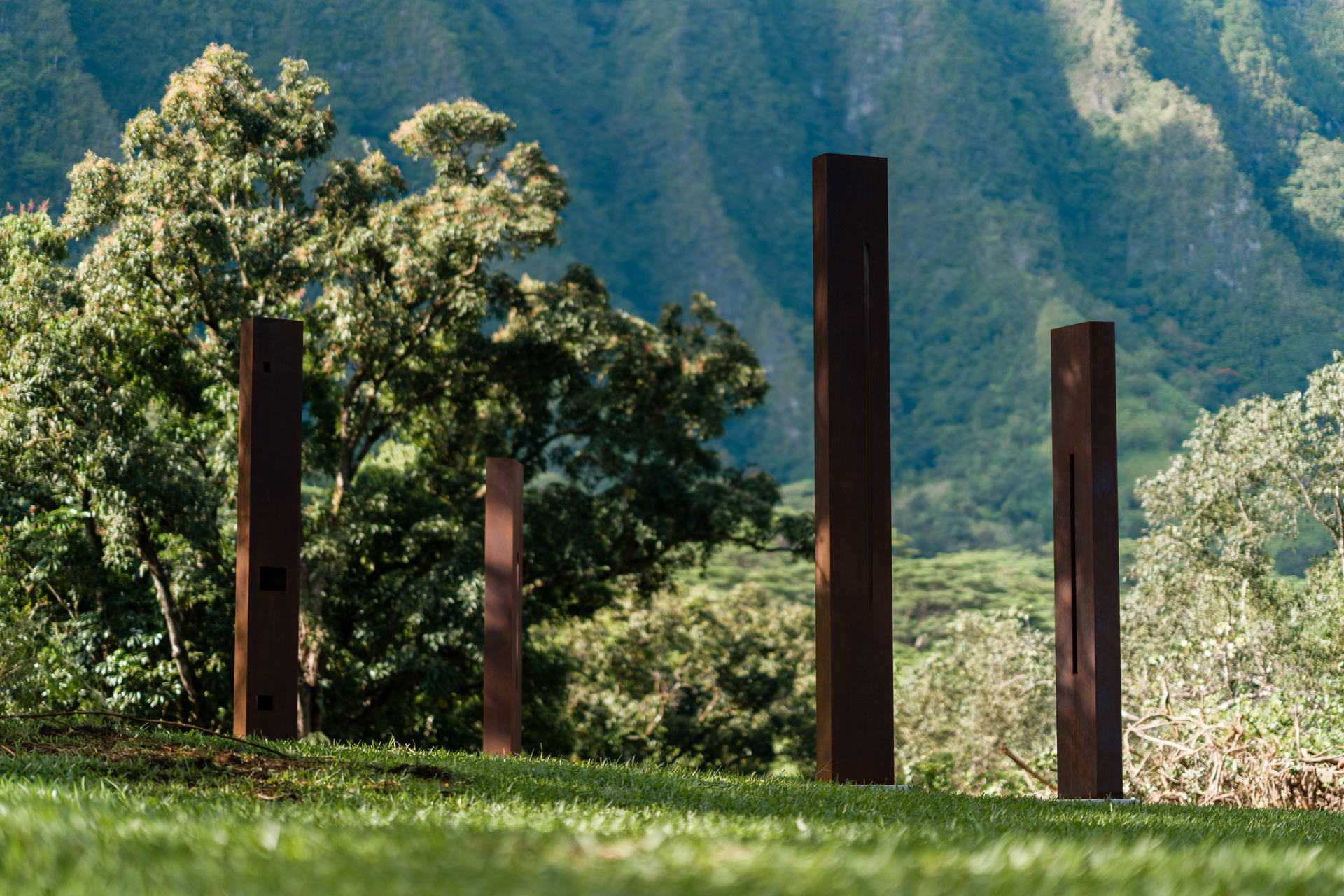 These four corten steel sculptures, placed as nānā or viewing portals, invite visitors to slow down, stand still, and kilo—to observe with intention. Each opening aligns with a puʻu (peak) of the Koʻolau Mountain Range: Konahuanui, Puʻu Lanihuli, Keahiakahoe, and the sacred waters of Hiʻilaniwai.