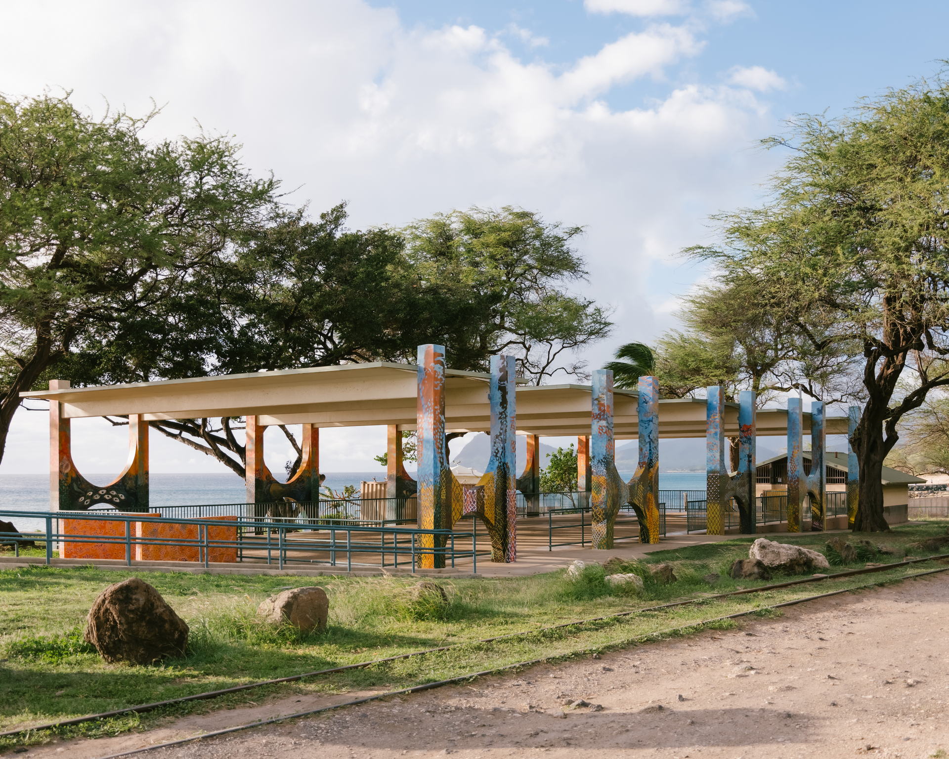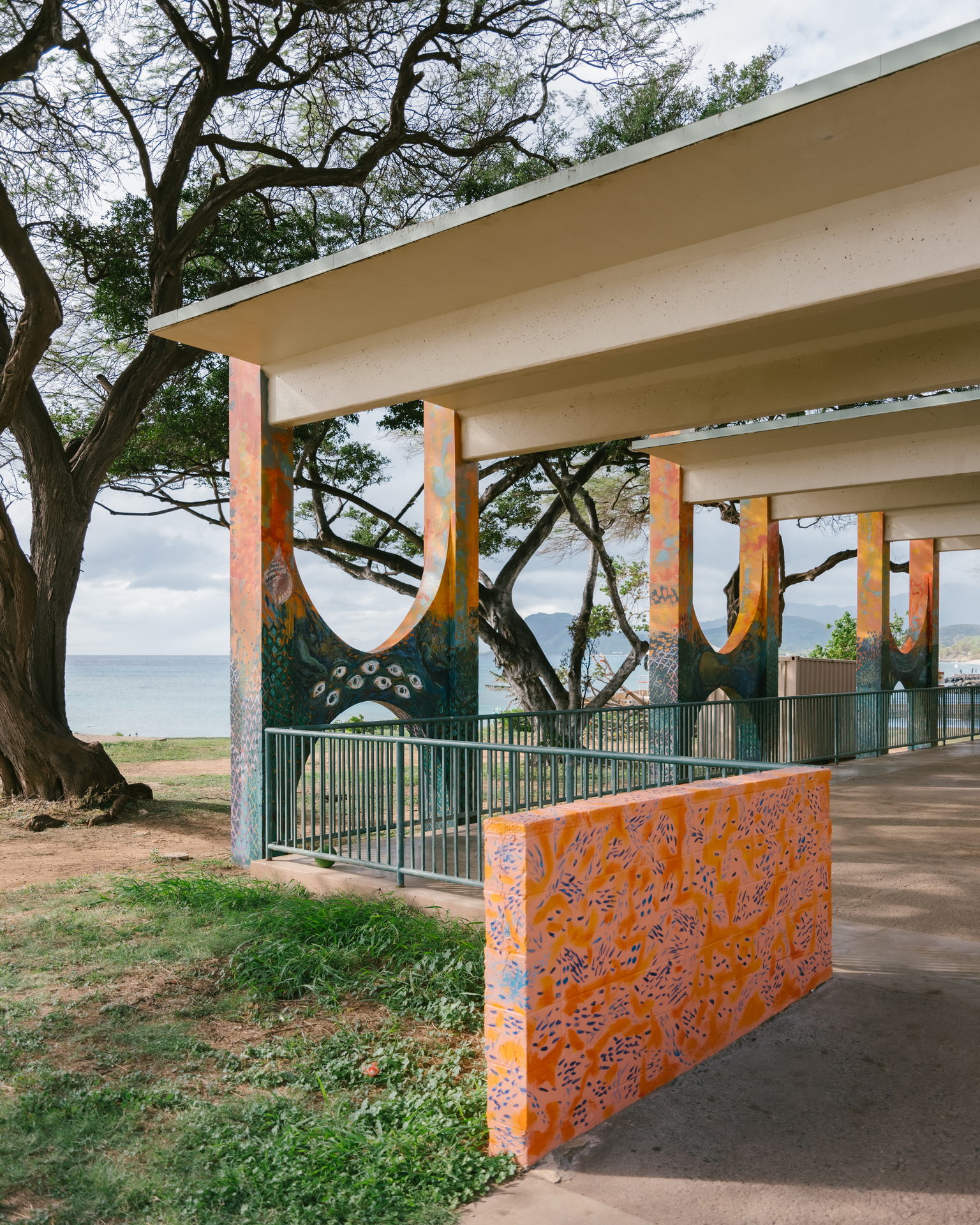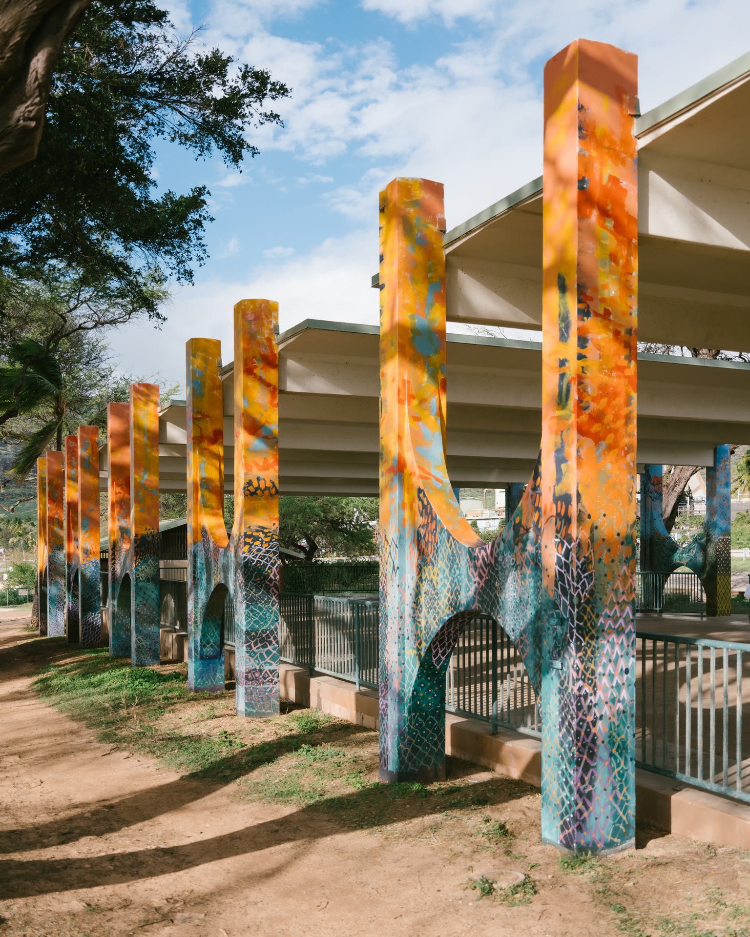 This mural reanimates the mo‘olelo of five adjacent ‘ili (land sections) within the Honouliuli ahupua‘a. Depicted across five sets of pillars, imagery of each ‘ili draws on the dualism of uka (upland) and kai (sea) to breathe life back into a space that was transformed after the land & coastal erasure activities of the Hawaiian Electric Company (HECO), Ko Olina Resort, and the Waimanalo Landfill. Let us recognize and celebrate our wahi kupuna.