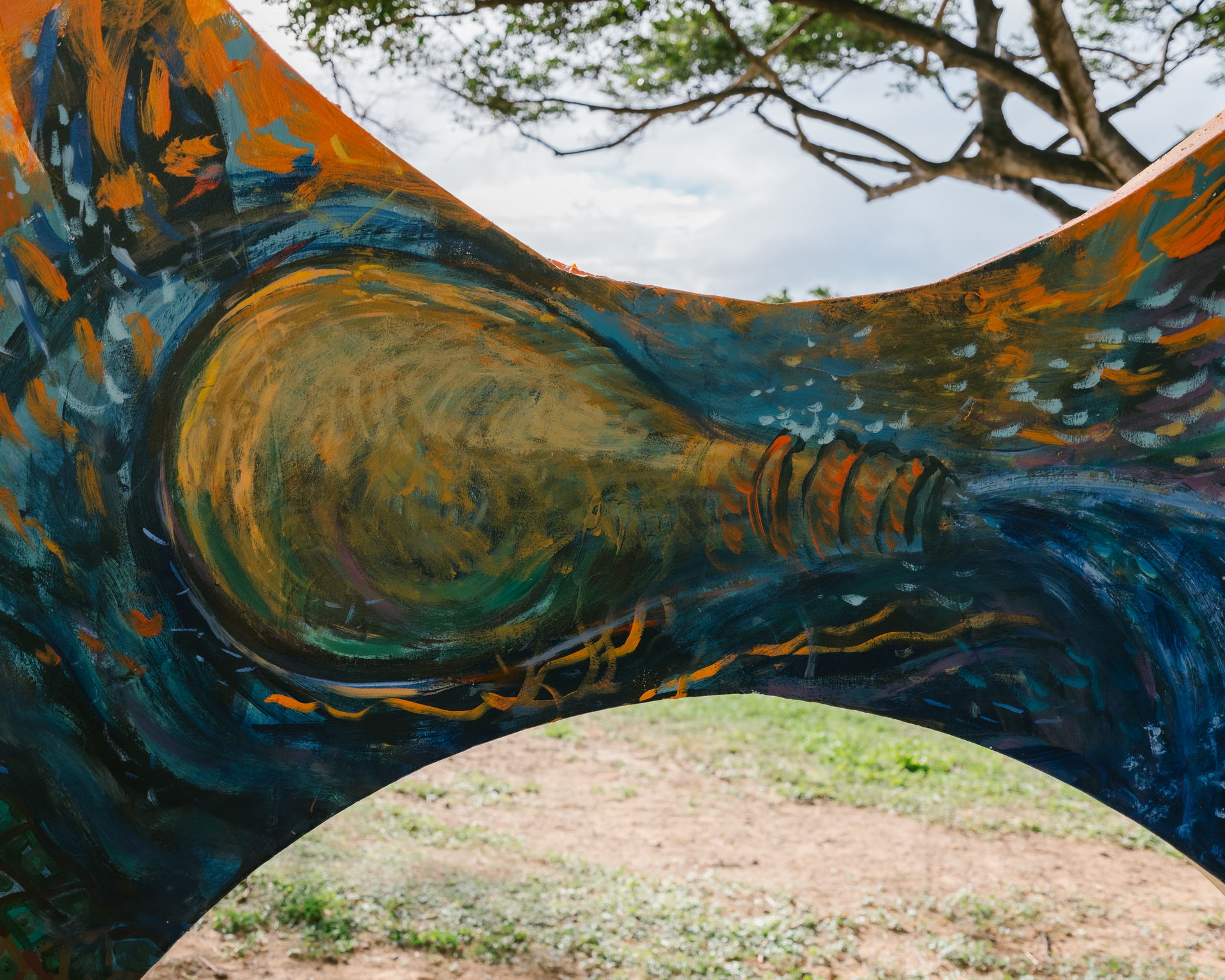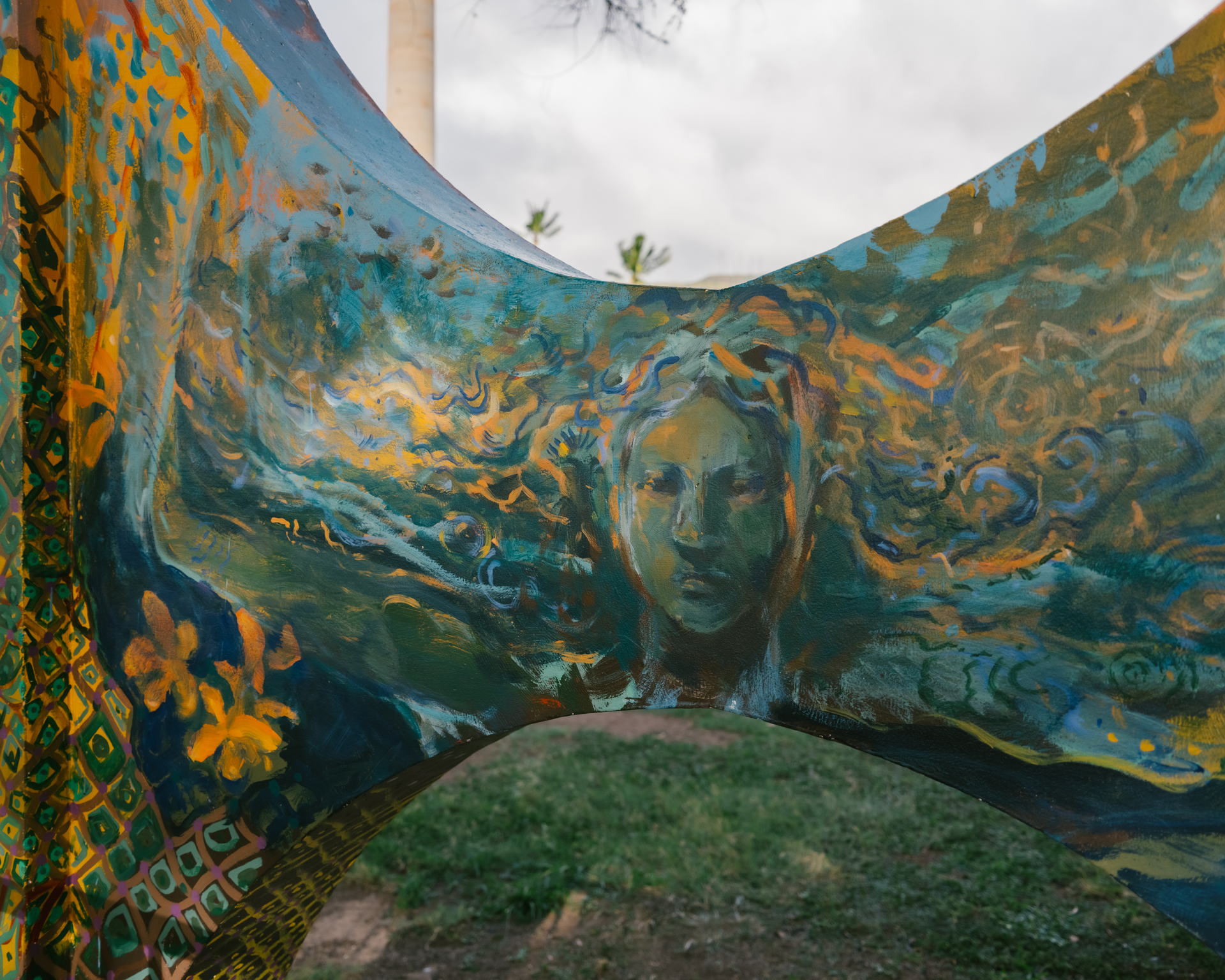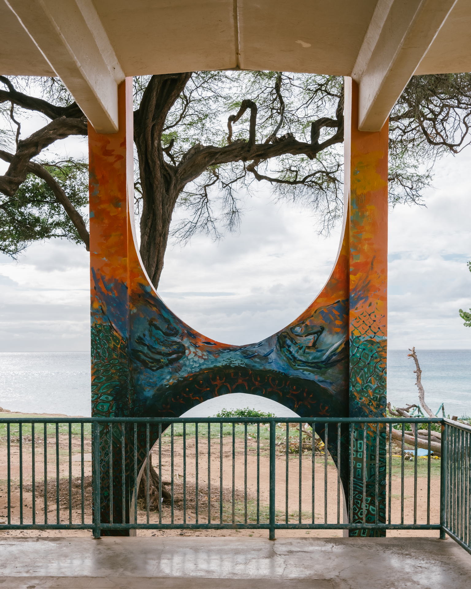 This mural reanimates the mo‘olelo of five adjacent ‘ili (land sections) within the Honouliuli ahupua‘a. Depicted across five sets of pillars, imagery of each ‘ili draws on the dualism of uka (upland) and kai (sea) to breathe life back into a space that was transformed after the land & coastal erasure activities of the Hawaiian Electric Company (HECO), Ko Olina Resort, and the Waimanalo Landfill. Let us recognize and celebrate our wahi kupuna.